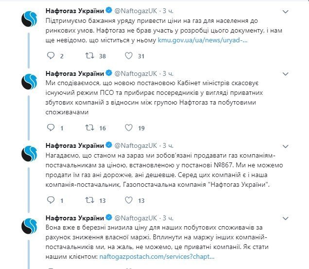 Нагадаємо, що станом на зараз ми зобов‘язані продавати газ компаніям-постачальникам за ціною, встановленою у постанові №867. Ми не можемо продати їм газ ані дорожче, ані дешевше. Серед цих компаній є і наша компанія-постачальник, Газопостачальна компанія «Нафтогаз України», – це з листування «Нафтогаз України» у Твіттері.