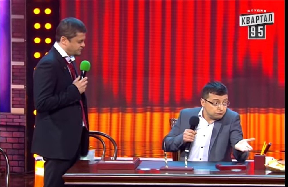 Володимир Зеленський грав роль Коломойського. Коломойський за сценарієм виходив “красавчиком”, він називав президента Порошенка Пєтєй-принципалом і казав, що у того не вийде спекти державний пиріг, бо «має цукор, борошно, шоколад, але не має яєць».
