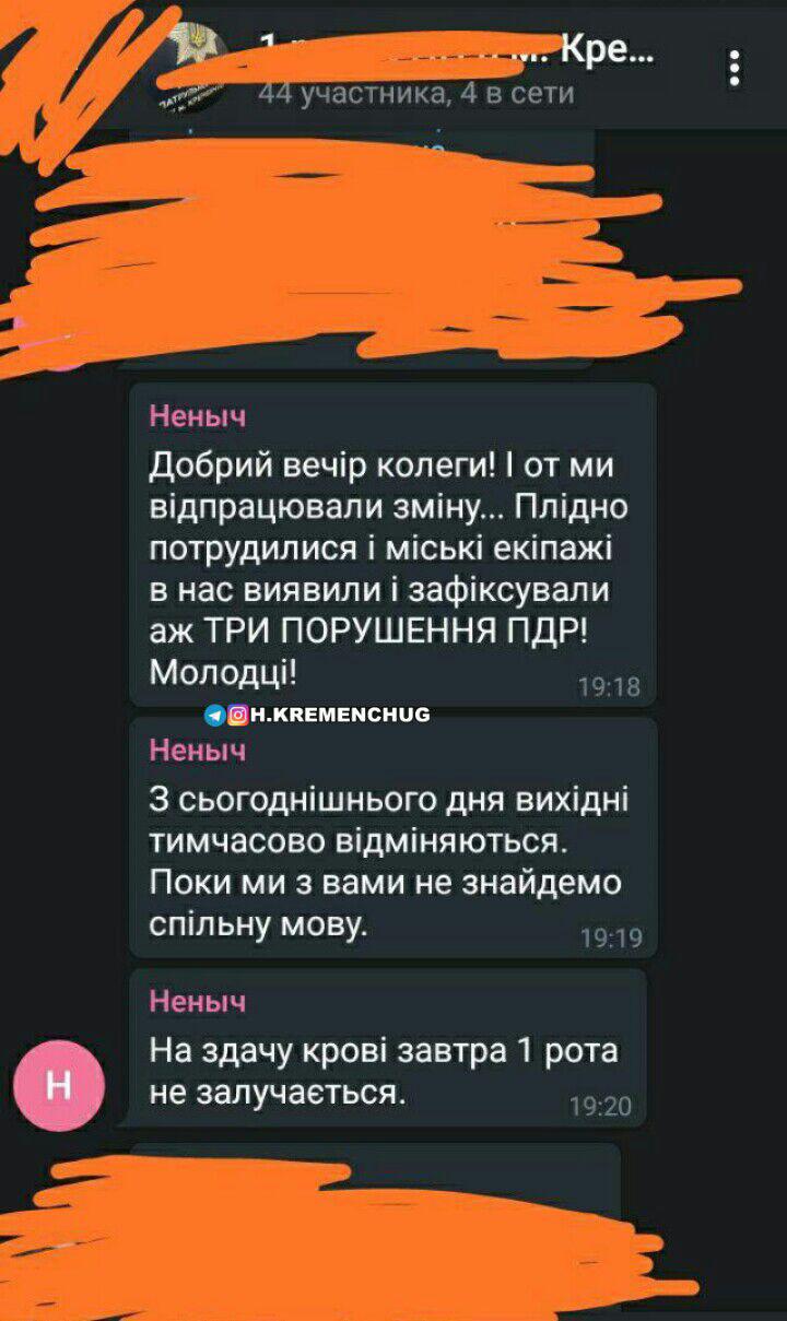Сьогодні, 19 червня, у кременчуцькій телеграм-спільноті h.kremenchug з’явився скріншот з фрагментом інтернет-листування патрульних поліцейських. Три повідомлення, про які йтиме мова, написав користувач з іменем «Неныч». Прочитавши повідомлення можна зробити висновок, що вихідні для патрульних скасовують, поки ті не почнуть виконувати план по протоколах. Згідно з декларацією за 2019 рік, у батальйоні патрульної поліції у місті Кременчук на посаді помічника командира батальйону працює Ненич Вадим Миколайович.