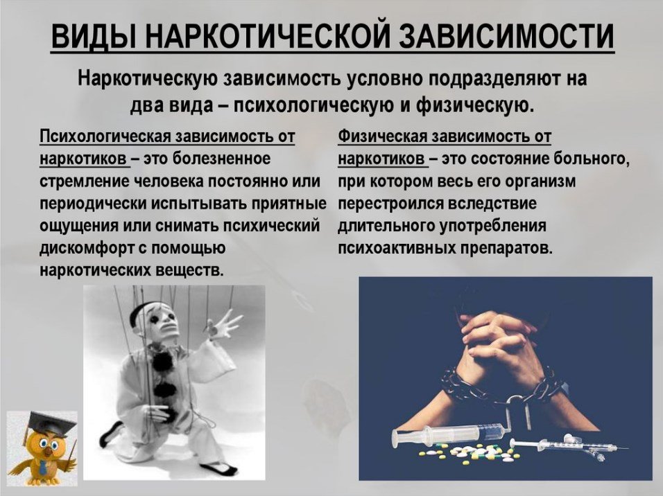 Психологічну. З хімічної залежності людину можна вивести, наприклад медикаментозно. Але психологічна залежність лишається. Психологічно людині комфортніше з наркотиком, ніж без нього. Вона лишається з думками і спогадами про те, як добре їй було під кайфом і їй хочеться відчути його знову. Вона повертається до вживання не тому, що організм її цього вимагає, а тому, що хочеться. Психологічну залежність коригувати важче.