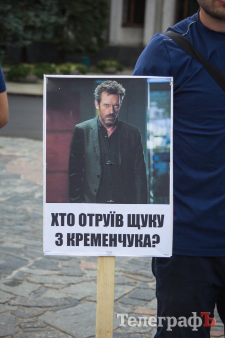 Рибалки зробили інсталяцію – принесли бутильовану воду і на ній встановили плакати. На одному з них зображений доктор Хаус (герой серіалу), який запитує: «Хто отруїв щуку з Кременчука?»