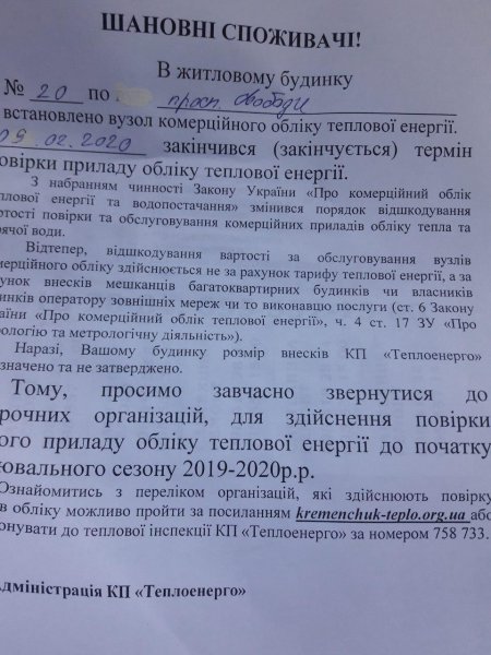 На фасадах кременчуцьких будинків почали з’являтися оголошення від КП «Теплоенерго» про те, що до початку опалювального сезону 2019-2020 років споживачі мають самі подбати про повірку комерційних приладів обліку (тобто будинкових лічильників тепла), оскільки ця послуга не включена до тарифу на теплопостачання. Клопіт матимуть мешканці тих будинків, в яких вичерпався міжповірочний інтервал лічильника. «Теплоенерго» на своєму сайті наводить списки організацій, куди можна звернутися, щоб повірити прилад обліку.