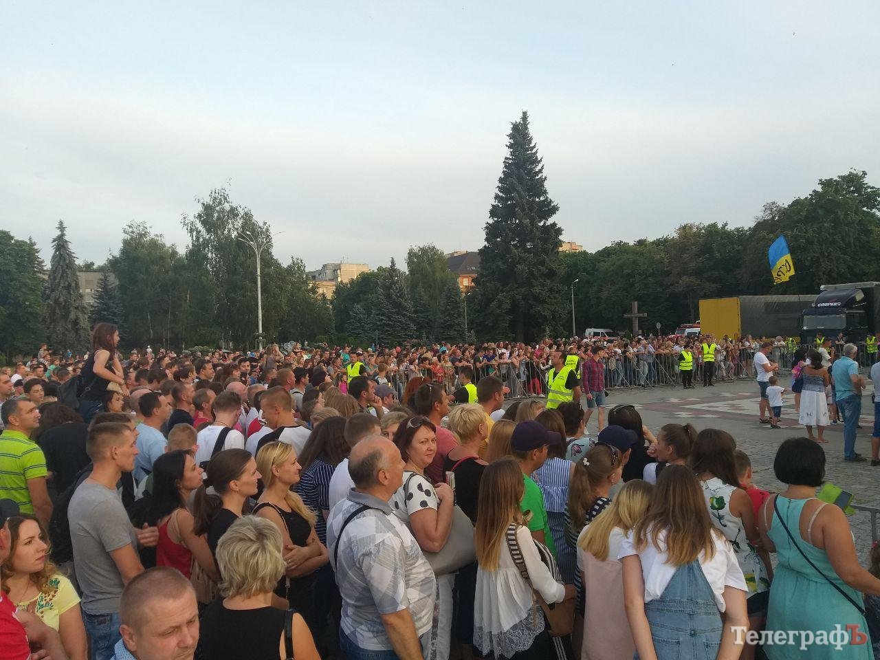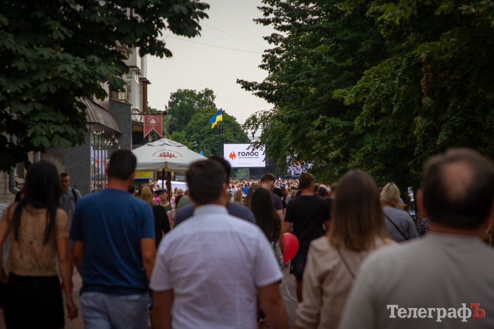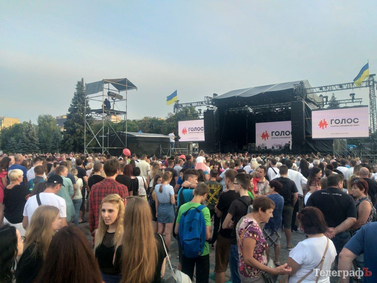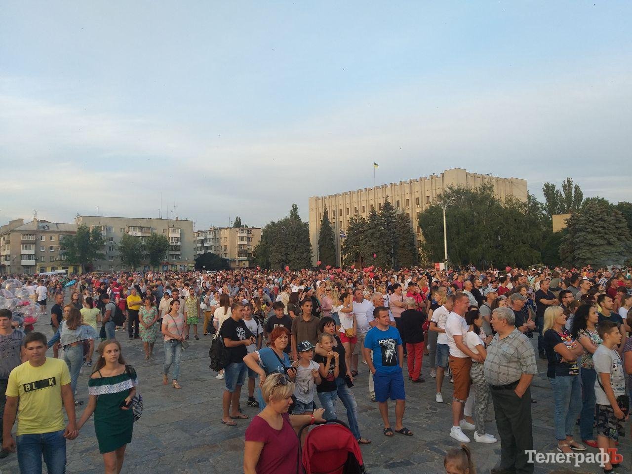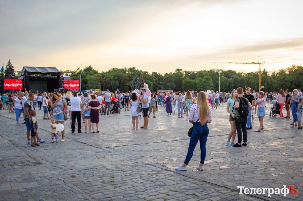 На площади Победы в Кременчуге начинается бесплатный концерт «Океана Эльзы». На площади собралось несколько тысяч кременчужан, возможно, десятков тысяч. Все боковые улицы (Коцюбинского, Победы), ведущие к площади Победы, забиты людьми, идущими на концерт.