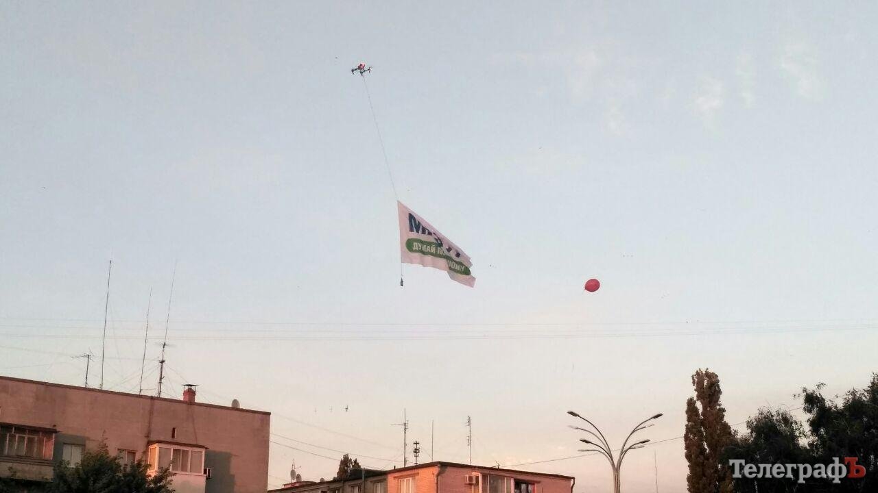Во время концерта над площадью пролетел квадракоптер с банером, на котором красовалась фамилия одного из кандидатов в народные депутаты по Кременчугу. Он явно выделялся на фоне красных шариков сторонников Партии Шария.