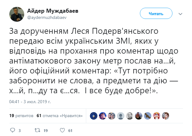 Що з цього приводу у Твіттері написав журналіст, медіаменеджер, заступник гендиректора телеканалу ATR Айдер Муждабаєв: