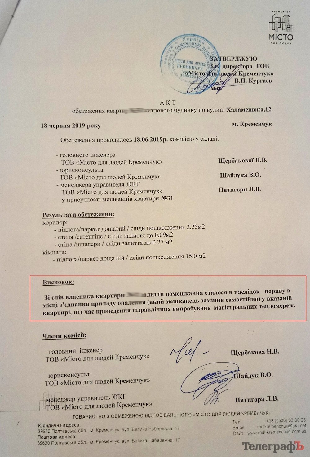Акты залития в тот день не составлялись. Как объяснила тогда главный инженер управляющей компании «Місто для людей. Кременчук» Наталья Щербакова, у них на месте уже не было людей, чтобы могла выехать комиссия и оформить документы (дело было в пятницу).