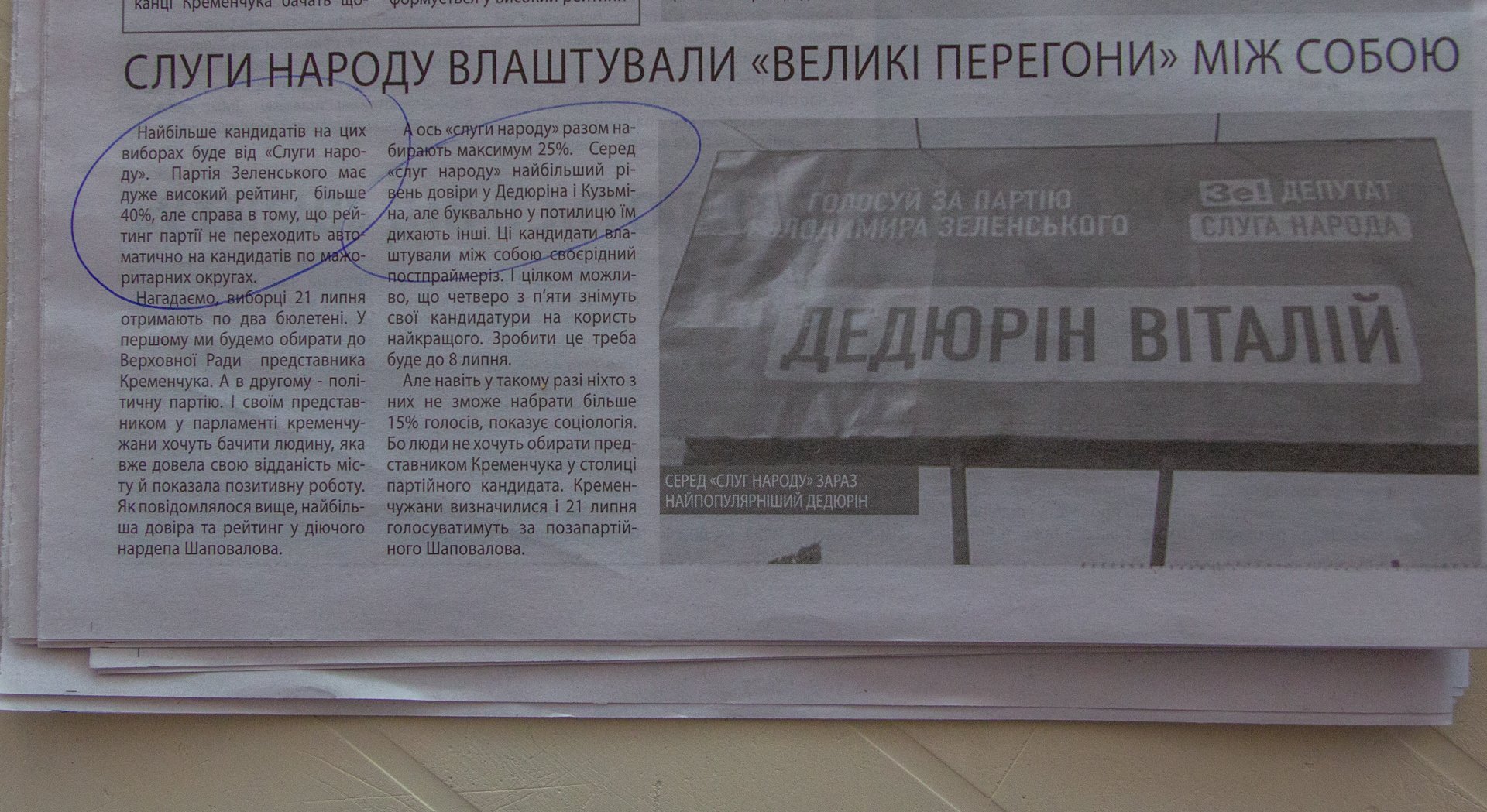 Потом в Кременчуге появились борды кандидатов Дедюрина и Кузьмина с одинаковым текстом: «Голосуй за партію Володимира Зеленського Зе! Депутат Слуга народу Дедюрін Віталій/Кузьмін Кирило».