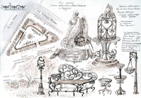 Я нашвидкуруч накидала план місцевості та мерщій до майстерні - малювати ескіз. Ідея вірних стосунків та невеличкий простір диктували певну стилістику: маленькі лави, немов софа, де зручно сісти парою. Невисокі світильники і ковані квітнички в центральному трикутнику. А змістовим акцентом мали стати голуби, які воркують на мереживній клітці… Ескіз легко вилетів з-під пера, і назва була теж готова. Із захватом розглядав малюнок Юрій Гриценко, а за мить зауважив, що не личить тут бути клітці. Краще, аби птахи сиділи на фонтані, а свіжа вода приваблювала живих голубів. Другий ескіз виглядав поетично: невеличкий двоярусний фонтан, чаші у формі лілеї, вода переливається з квітки у квітку і минає прозору конструкцію кованого столика. Нагорі пара: голуб залицяється до голубки, розгорнув крила навколо неї, став навшпиньки.