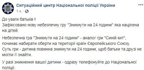 Прес-центри МВС України та ситуаційного центру Нацполіції України опублікували на своїх сторінках у Фейсбуці попередження про те, що правоохоронці зафіксували нову небезпечну гру під назвою «Зникнути на 24 години», яка націлена на дітей.