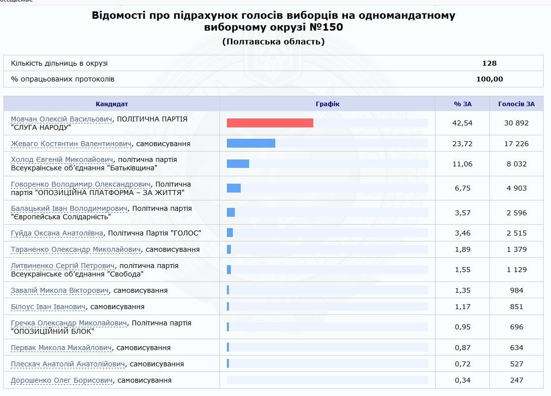 Парламентские выборы 2019-го принесли неожиданный результат – на 150 округе, на котором регулярно побеждал Константин Жеваго, победу одержал 25-летний Алексей Мовчан. Мовчан – кандидат от президентской партии «Слуга народа». За него проголосовало 30 892 избирателя (42,54%). Жеваго получил 17 226 голосов (23,72%).