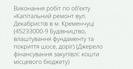 22 липня департамент ЖКГ Кременчуцької міськради провів тендер на капітальний ремонт дороги на вулиці Декабристів. Очікувана вартість закупівлі складала 2,9 млн грн. Наразі триває етап кваліфікації переможця - ПП «Перша українська будівельна компанія». Це підприємство зі Світловодська запропонувало найнижчу серед учасників ціну 2,85 млн грн. Інформація про тендер розміщена в системі електронних закупівель ProZorro.