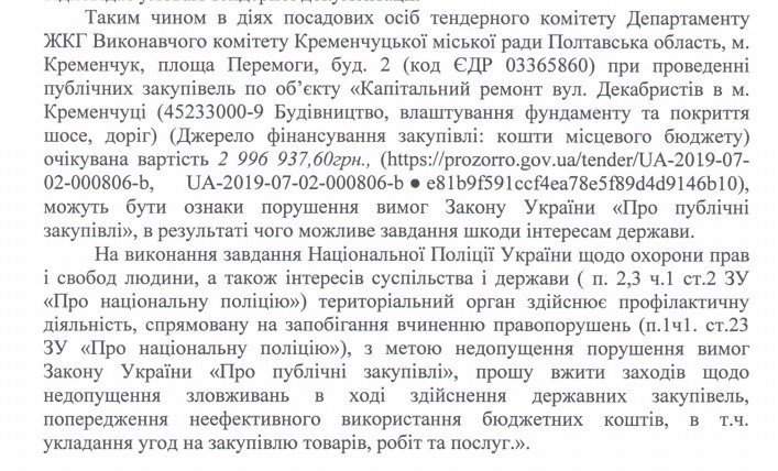 25 липня тендерний комітет департаменту житлово-комунального господарства відхилив пропозиції обох учасників тендеру на ремонт дороги на вулиці Декабристів у Кременчуці. Протоколи розміщені в системі електронних закупівель ProZorro.