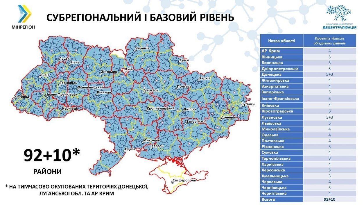 На сайті Мінрегіону нову модель адміністративно-територіального устрою представляють як модель «ідеальної європейської України», де замість 490 районів буде сформовано 102:92 на підконтрольній території України і ще 10 на тимчасово окупованій території та у Криму.