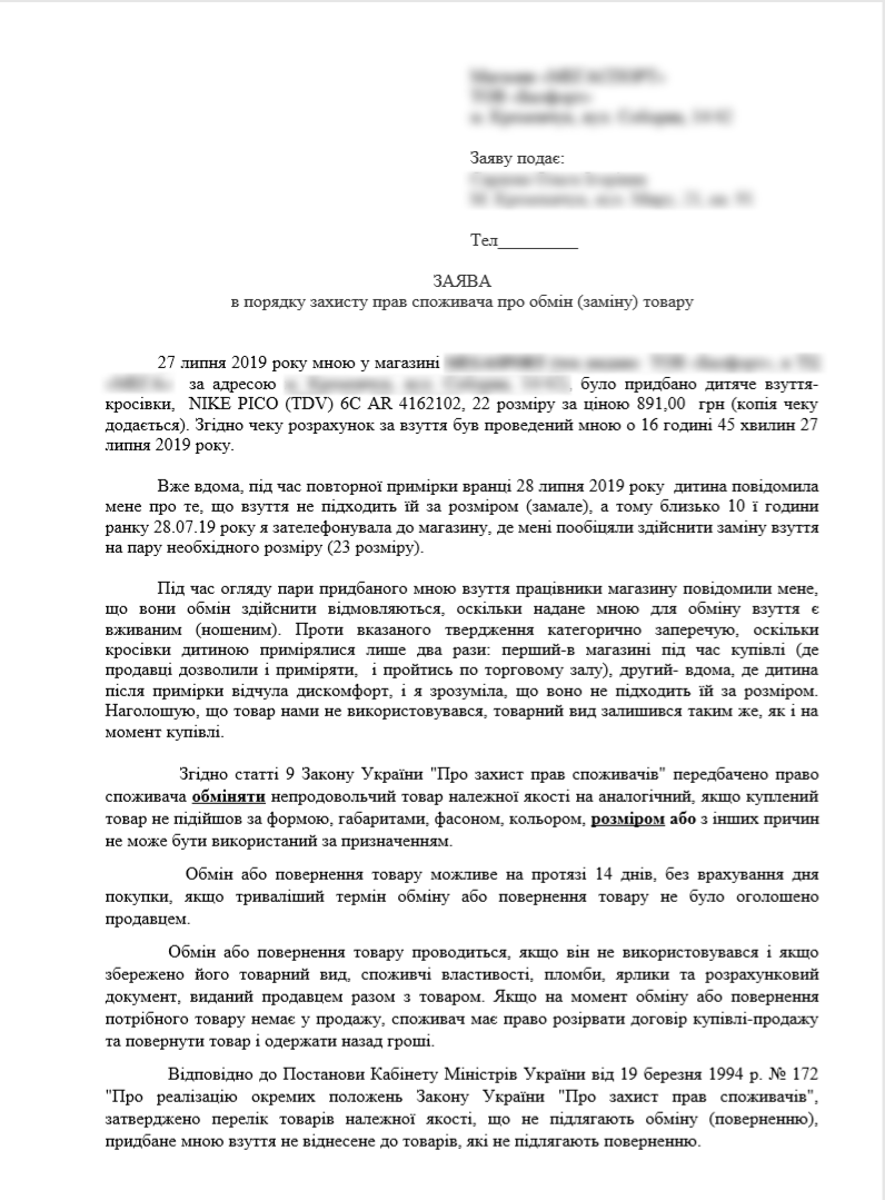 Адвокат пояснив, що треба писати скаргу на ім’я директора мережі магазинів у Києві та допоміг її правильно скласти. Скаргу Ольга роздрукувала у двох екземплярах: один екземпляр вона мала віддати до магазину, де його повинні були підписати та надати директору, а другий залишався їй.