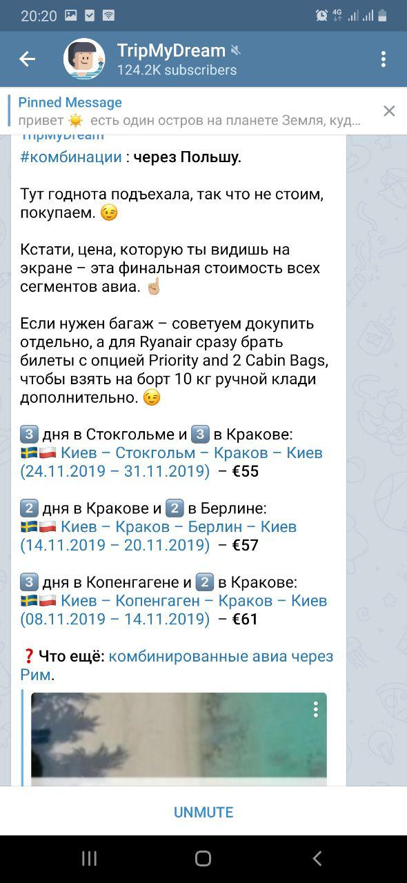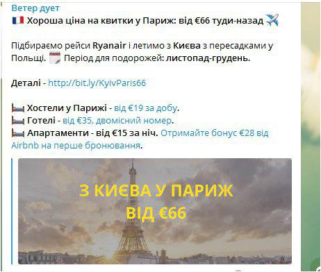- Подписаться на тревел-каналы в telegram и на новости авиакомпаний. Многие авиакомпании устраивают праздничные скидки, каждый месяц можно найти акционные билеты. Особое внимание стоит обратить на Ryanair – это крупнейший лоукостер, цены у которого по многим направлениям стартуют от 300 грн. Слетать в Вену или Стокгольм по цене маршрутки Кременчуг-Киев реально.
