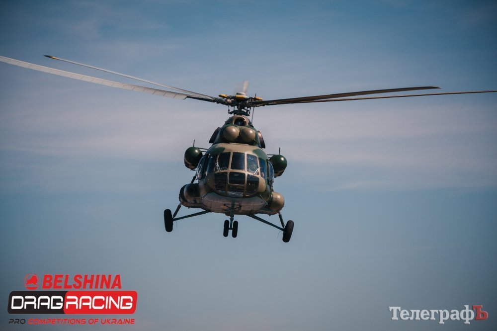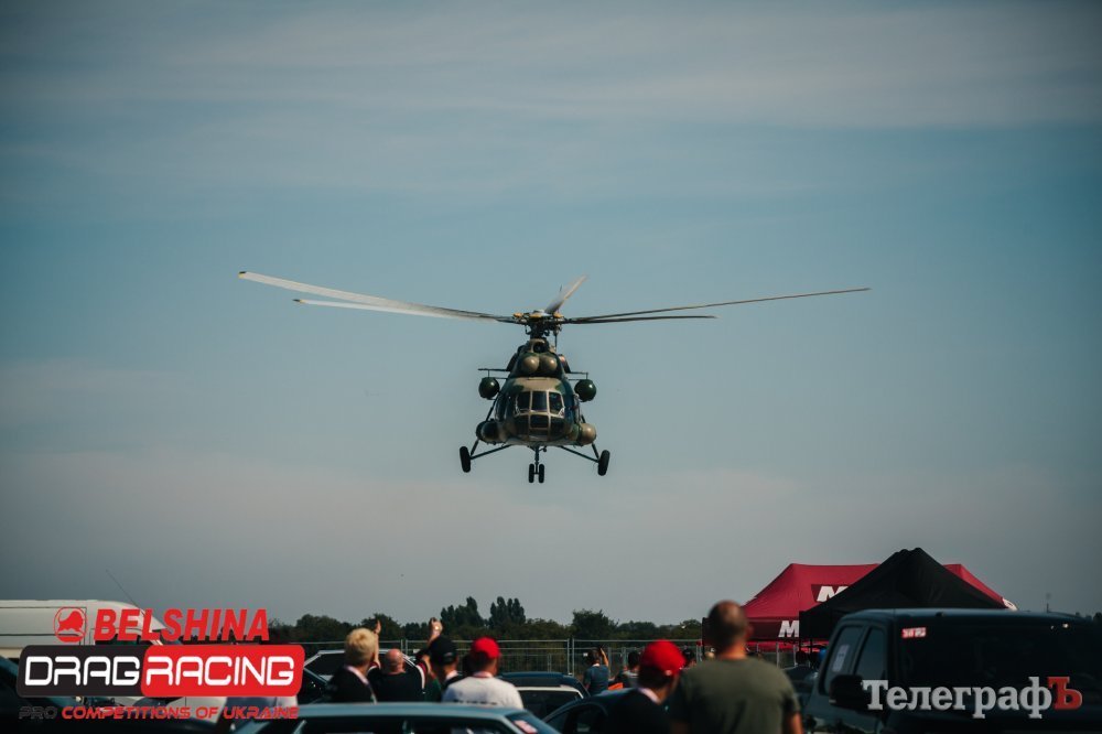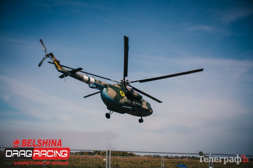 Над аэродромом во время чемпионата по дрэг-рейсингу кружил военный вертолёт как «воздушный» участник соревнований.