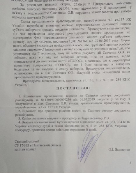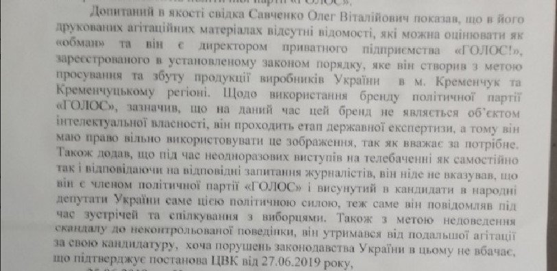Бывший кандидат в народные депутаты кременчужанин Олег Савченко* во время парламентских выборов использовал название и символику партии Вакарчука «Голос», не будучи членом этой партии. Официальный кандидат от партии «Голос» по Кременчугскому округу Ростислав Зауральский обратился в полицию. По его заявлению полтавская полиция открыла уголовное производство – и закрыла его, не обнаружив в действиях Савченко состава преступления.