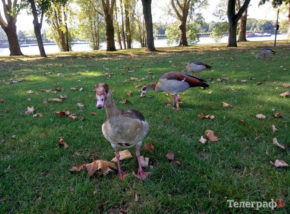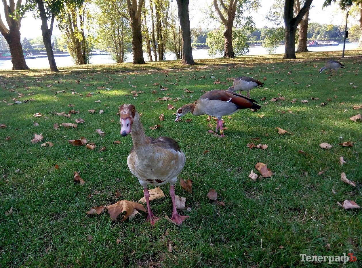 Тут усе для комфорту людей. На берегах Рейну є спеціальні зони для відпочинку, куди можна виїхати на пікнік та посмажити гриль, звісно, прибравши за собою. І тут це роблять! На величезній зеленій галявині, засіяній газонною травою, не побачиш жодного папірця, жодного недопалка. Натомість гуляють птахи — майже ручні: зовні схожі на качок, але трохи більші. Потім я їх «погуглила»: виявилося — єгипетські (або нильські) гуси.