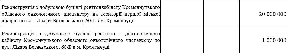 Ось витяг із додатку до рішення облради №1107 «Про внесення змін до показників обласного бюджету на 2019 рік» (мова йде про той самий об’єкт, але внесена назва в адресу - зняли 20 млн грн, повернули 1 млн).