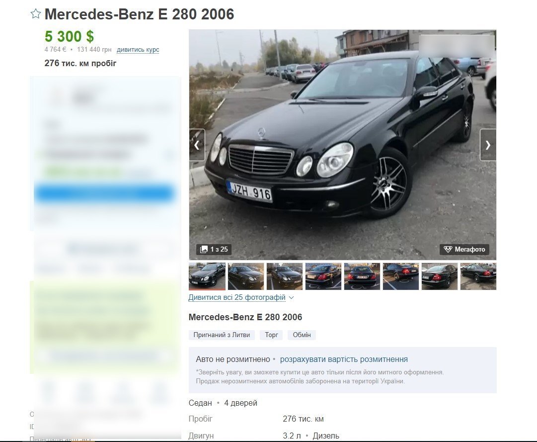 Результат: 5 300 доларів коштує нерозмитнена машина, що в національній валюті становить 131 440 гривень. Розмитнити Mercedes-Benz E 280 2006 буде коштувати майже 139 тисяч гривень.