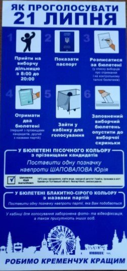 Ось ця листівка, яка спонукає голосувати за Шаповалова – і в ній використане гасло «Робимо Кременчук кращим»