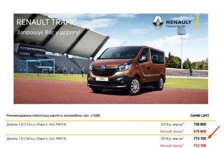 Продавець — ТОВ «Соллі Плюс. Кременчук» (місцевий дилер автомобілів Renault). Ми перевірили ціну на сайті дилера. Він пропонує «зустріти» Trafic від 653,8 тис грн. Зрозуміло, що це базова ціна. Завантаживши прайс, ми побачили рекомендовану ціну автомобіля Renault Trafic Combi з двигуном 1,6 (140 к.с.) - 772,7 тис грн. Це на 62 тис грн дешевше, ніж купив КП «Кременчукводоканал». Зважаючи на стрибки курсу іноземної валюти, від якої залежить ціна Renault, можна говорити про завищення ціни принаймні на 50 тис грн.