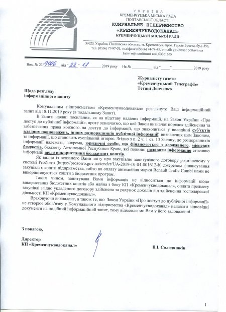 На підприємстві хибно вважають, що не зобов'язані надати відповідь на подібний інформаційний запит. Відповідь-відмову у наданні договору на авто підписав директор КП «Кременчукводоканал» Віктор Солодяшкін.