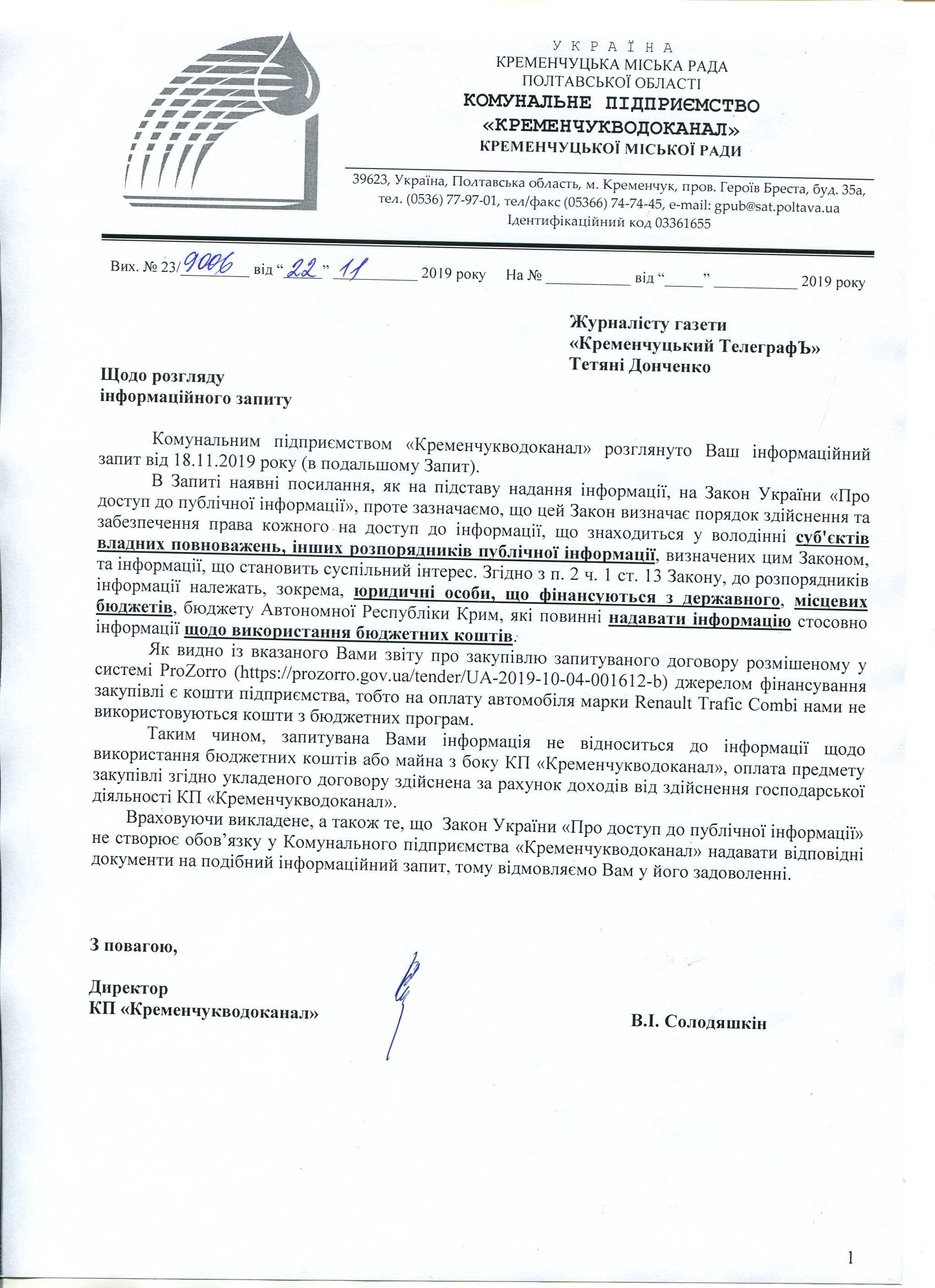На підприємстві хибно вважають, що не зобов’язані надати відповідь на подібний інформаційний запит. Відповідь-відмову у наданні договору на авто підписав директор КП «Кременчукводоканал» Віктор Солодяшкін.