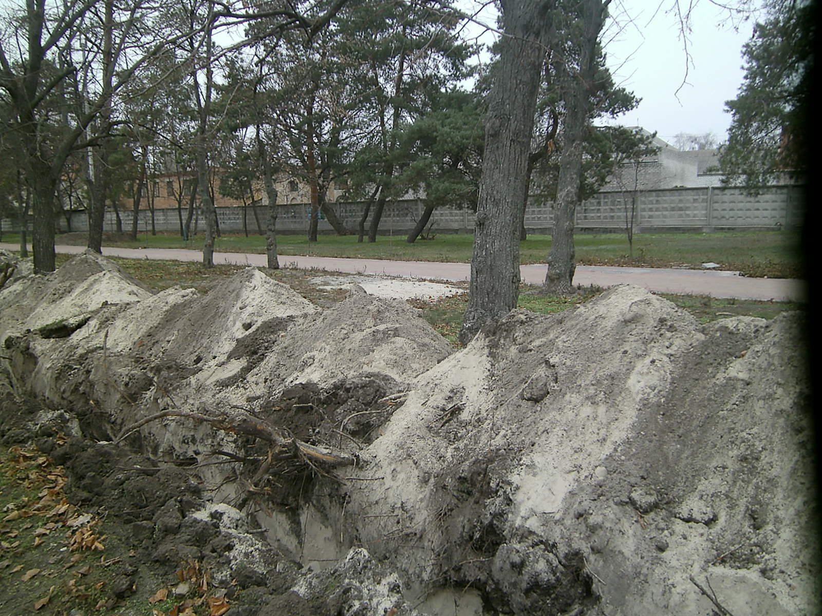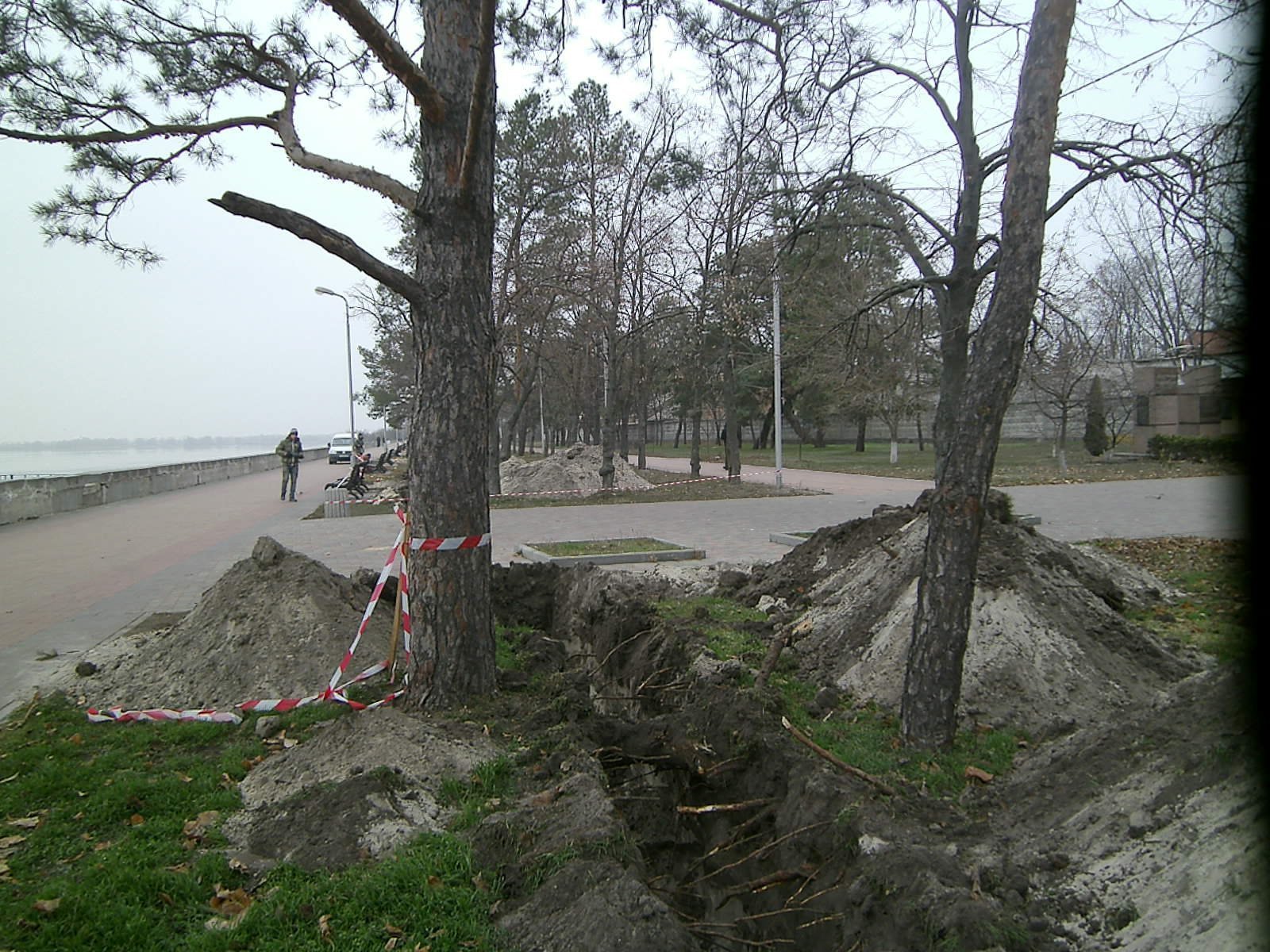 В Приднепровском парке при рытье траншеи порубили корни растущим вдоль набережной липам и соснам. Директор парка Александр Мирошниченко сообщил, что работы проводила фирма «Олевия» для реконструкции внешнего освещения набережной.