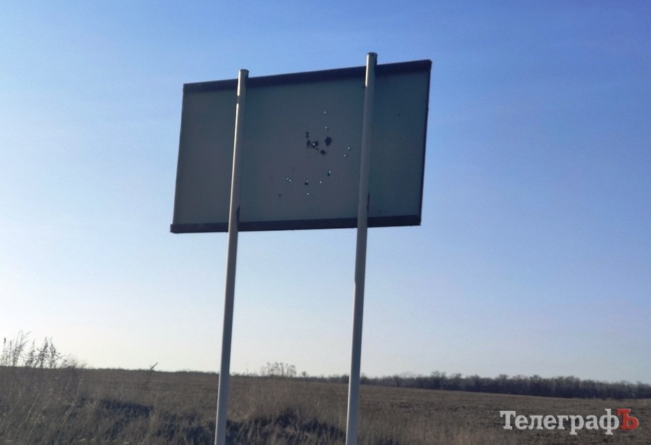 Той же знак, але з іншого боку. На ньому видно отвори після пострілів