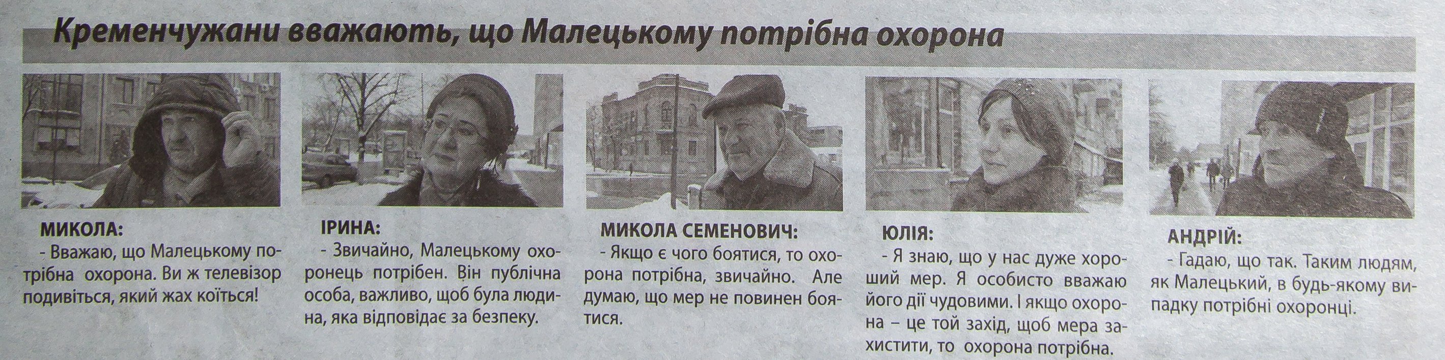 4 декабря журналисты коммунальной телекомпании вышли на улицы и вдруг стали спрашивать кременчужан, нужна ли мэру Малецкому личная охрана? Что отвечали все интервьюируемые кременчужане, мы не узнаем. Но те, чьи ответы попали в видеосюжет, говорили: да, наверное нужна, и ссылались на то, что мэр – чиновник, руководитель, а также на криминогенную ситуацию в стране. Конкретного фигуранта, от которого нужно охранять мэра, никто из героев сюжета не назвал.