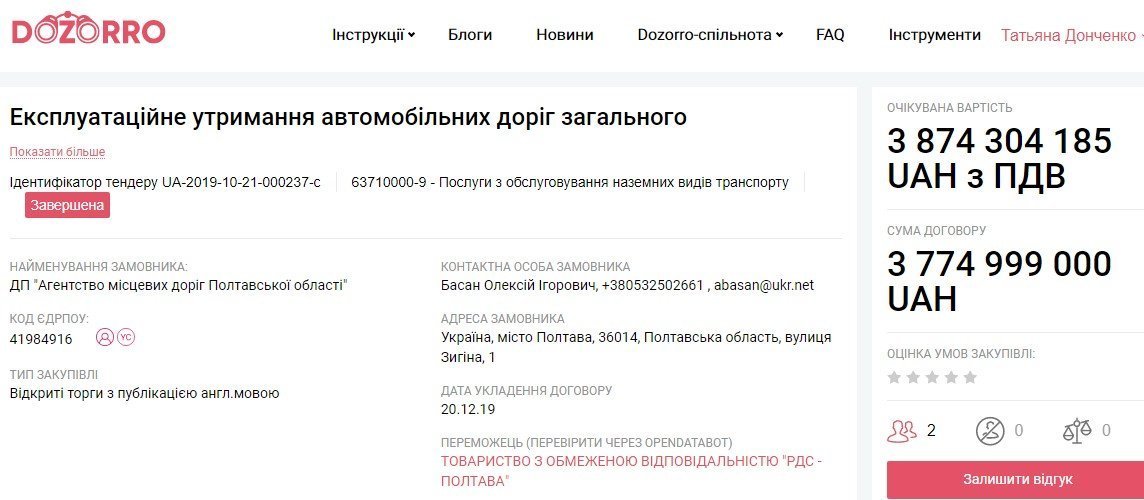 Новостворене ТОВ «РДС-Полтава» отримало «під ялинку» один з найбільших контрактів у Полтавській області на суму 3 млрд 775 тис грн (точніше 3 774 999 000 грн). «Експлуатаційне утримання автомобільних доріг загального користування» – так називається предмет закупівлі – послуга, яку замовило на 2020-2022 роки державне підприємство «Агентство місцевих доріг Полтавської області», засновником якого є Полтавська ОДА. Закупівля проводилася на так званих європорогах – торги з публікацією оголошення англійською мовою.