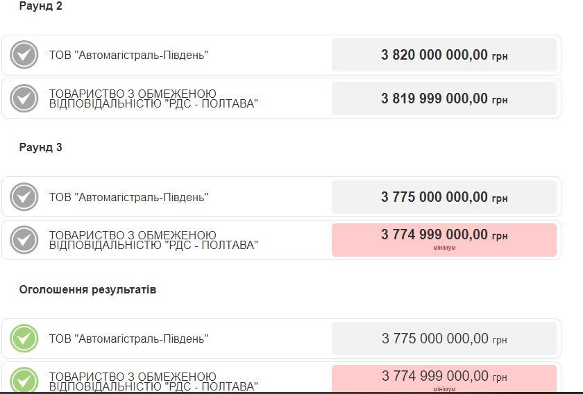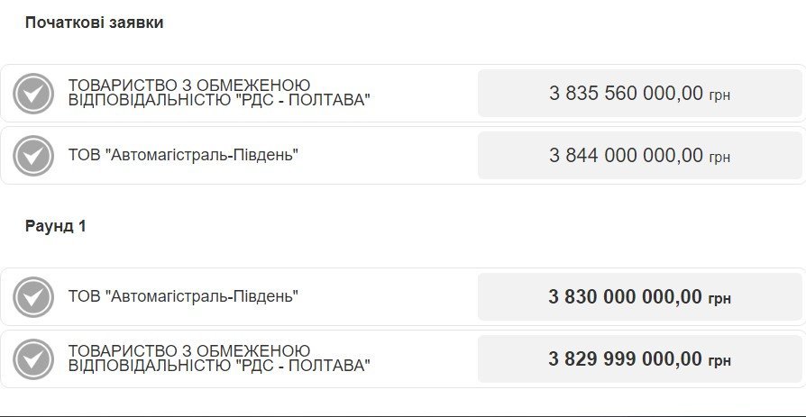 Критерій оцінки пропозицій на цьому тендері був виключно ціновий. І пропозиція ТОВ «Автомагістраль-Південь» виявилася дорожчою усього на одну тисячу гривень, ніж у переможця – це мізерна сума порівняно з мільярдами, за які змагалися учасники.