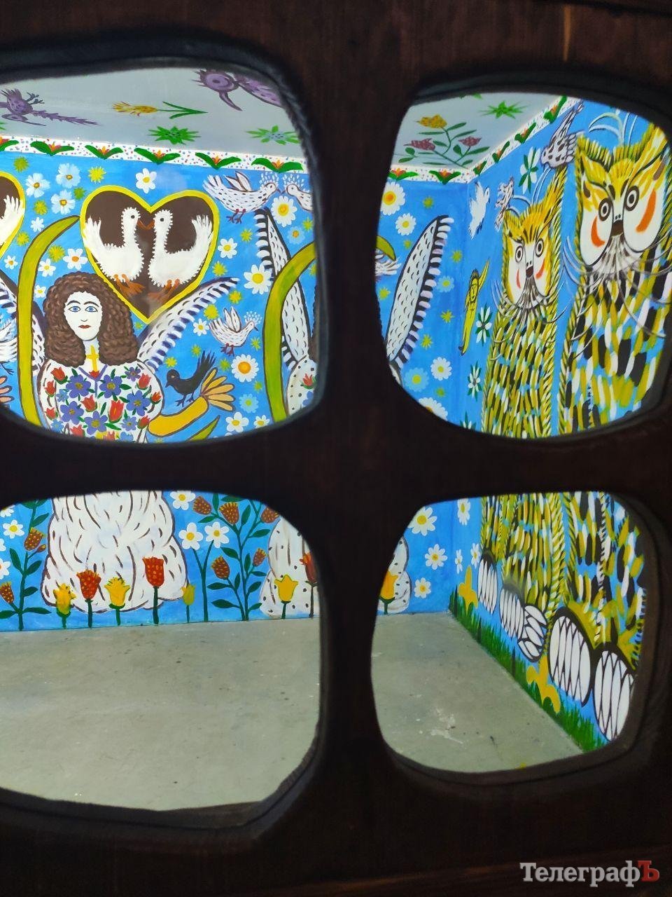 Потрапити у хату Поліни Райко можна також через жовті дверцята. Там маленька українська хата, яка повністю розписана малюнками, що повторюють розпис української художниці-примітивістки. Протягом двох тижнів будиночок розфарбовували співробітники фонду імені художниці. Цікаво, що сама художниця почала малювати у 69 років. Жінка купувала фарби на свою пенсію за копійки, тому невідомо, скільки років зможуть зберігатися її дивовижні малюнки. Обов’язково поїдьте в Олешки, рідне село художниці, там стоїть розписаний нею будинок.