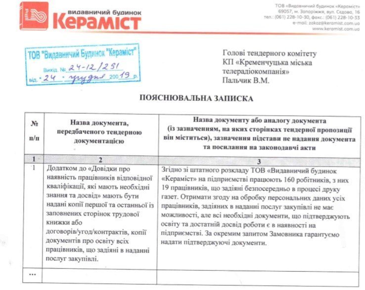 Натомість ТОВ «Видавничий будинок «Кераміст» надав замість цих документів пояснювальну записку на ім’я голови тендерного комітету про те, що на підприємстві працює 160 робітників, з них 19 працівників, які безпосередньо задіяні в процесі друку газет.