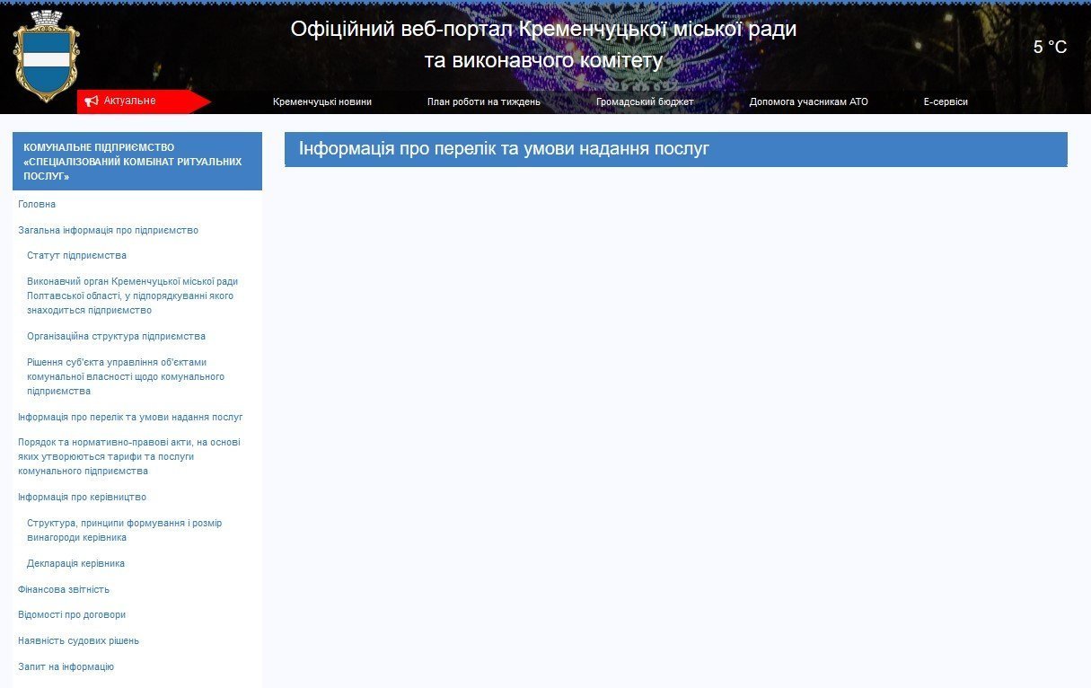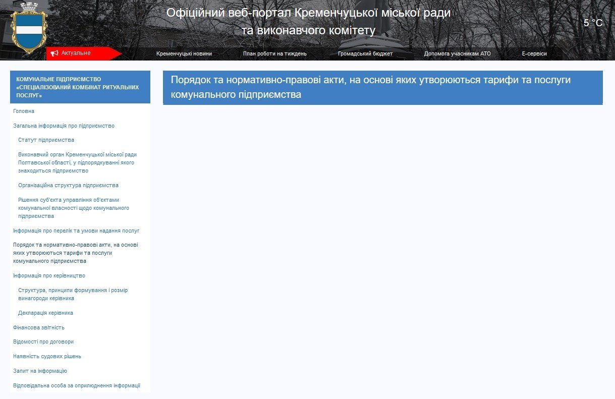 Прейскуранта цен СКРУ в открытом доступе на официальном сайте Кременчугского горсовета нет. Вот так по состоянию на 30 января выглядит соответствующая информационная страница:
