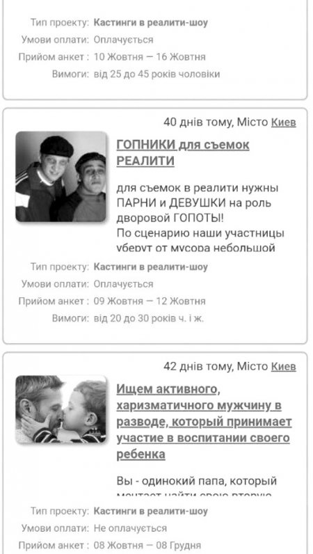 Можно подработать и женщиной-скандалисткой. Поскандалить немного на камеру стоит 200 грн за два часа. Подойдет злая женщина в возрасте 35-50 лет, “такая, как работница паспортного стола”, пишут организаторы. Для “душевных монологов” про жизнь участниц реалити-шоу нужны пенсионерки. Туда же набирают гейшу, желательно азиатской внешности. И очень нужен помощник шамана для проведения обрядов: только крепкие мужчины 27 +. А на съемку программі “Утро с Украиной” нужна женщина, недовольная покупками, которая хочет их вернуть. А еще мужчина, выбирающий косметику для жены, и барышня размера “плюс сайз”.