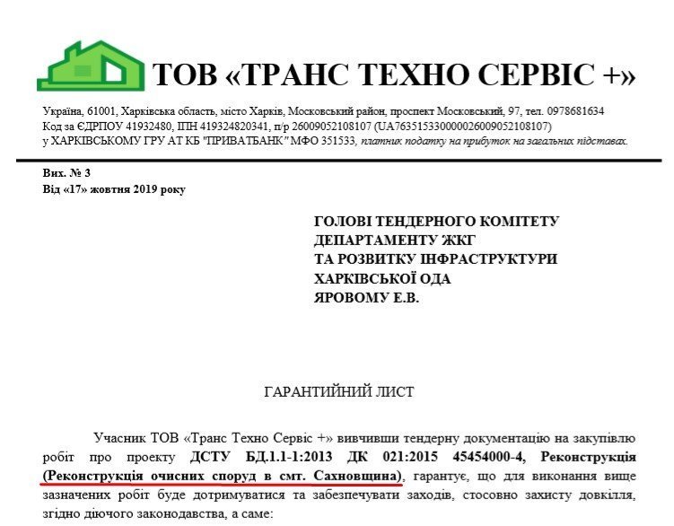 ТОВ «Транс Техно Сервіс +» – третій учасник торгів – теж не знижував ціну. У заявці цієї фірми ми побачили купу документів взагалі на інший об’єкт – реконструкцію очисних споруд у селищі Сахновщина.