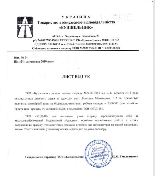 І не лише це їх поєднує. Як виявилося, ТОВ «КПД-18» працювало субпідрядником у ТОВ «Будівельник», причому на цьому ж об’єкті – на реконструкції дитсадка на вул. Генерала Манагарова, 5-А.