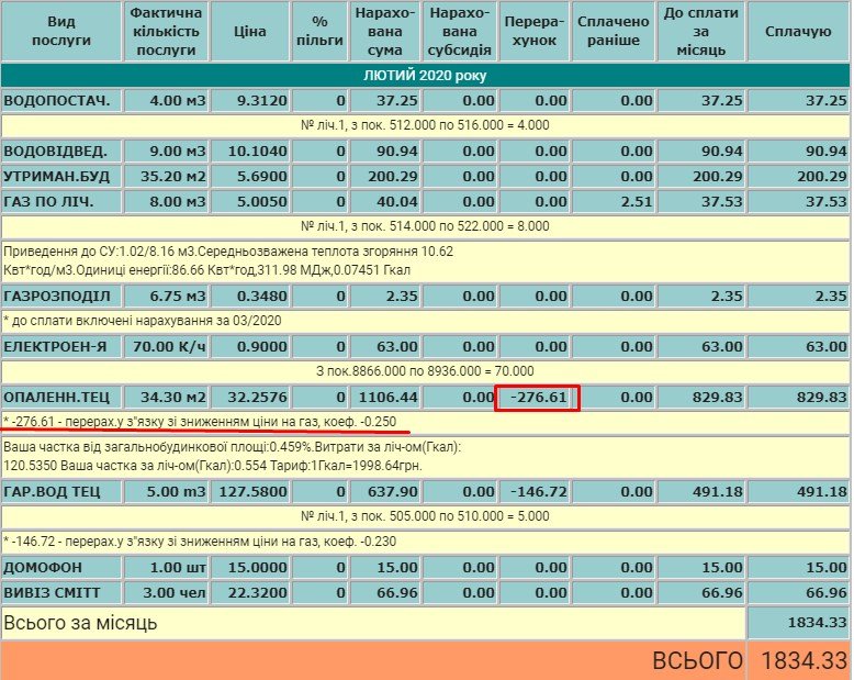 Зазначимо, що перерахунок за лютий — найсуттєвіший за сезон (див. таблицю).