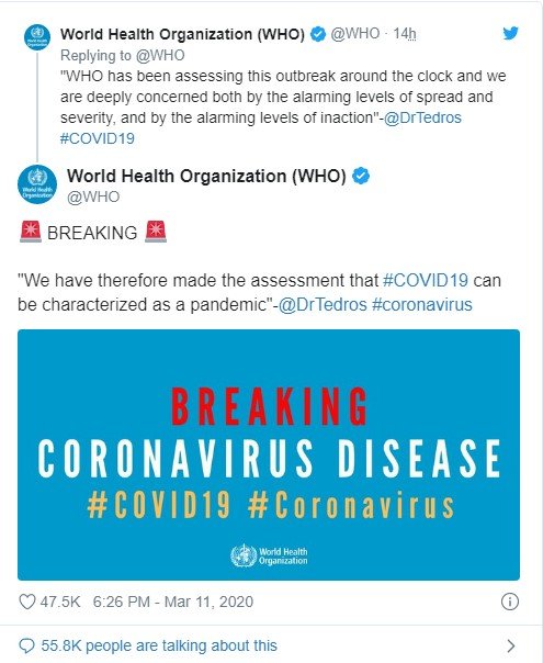 11 березня Всесвітня організація охорони здоров’я оголосила про пандемію коронавірусу в світі.
