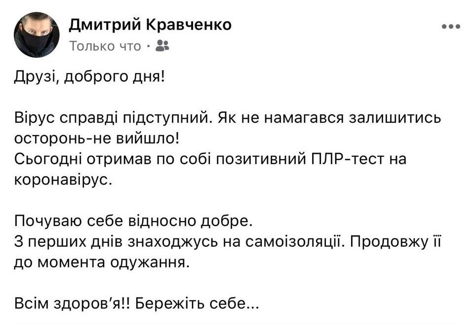 – Друзі, доброго дня! Вірус справді підступний. Як не намагався залишитись осторонь — не вийшло! Сьогодні отримав по собі позитивний ПЛР-тест на коронавірус.