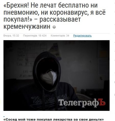 13 мая руководитель кременчугского управления здравоохранения Максим Середа заявил, что пациентов с подозрением на коронавирус, коронавирусом и пневмониями в городских больницах лечат бесплатно. После этого в «ТелеграфЪ» обратился кременчужанин Сергей – он рассказал, что лежал с пневмонией с подозрением на коронавирус в инфекционном отделении больницы «Кременчугской», и практически все лекарства покупал за собственные деньги. Сергей предоставил чеки на покупки.