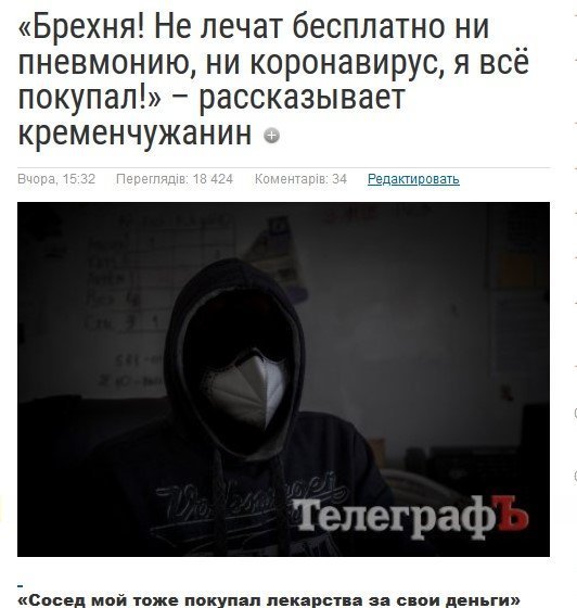 13 мая руководитель кременчугского управления здравоохранения Максим Середа заявил, что пациентов с подозрением на коронавирус, коронавирусом и пневмониями в городских больницах лечат бесплатно. После этого в «Телеграф» обратился кременчужанин Сергей – он рассказал, что лежал с пневмонией с подозрением на коронавирус в инфекционном отделении больницы «Кременчугской», и практически все лекарства покупал за собственные деньги. Сергей предоставил чеки на покупки.