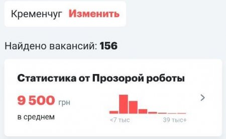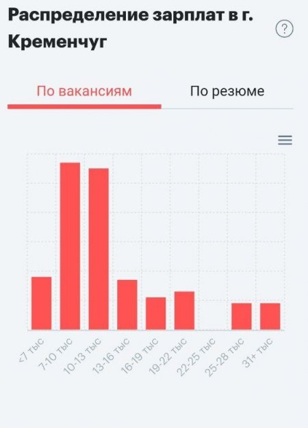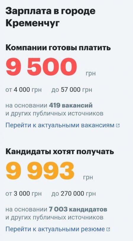 Сайт rabota.ua оценил среднюю зарплату в Кременчуге как 9,5 тыс грн, а соискатели хотят получить около 10 тыс грн. В основном, по данным сайта, работодатели предлагают в Кременчуге 9-13 тыс грн.