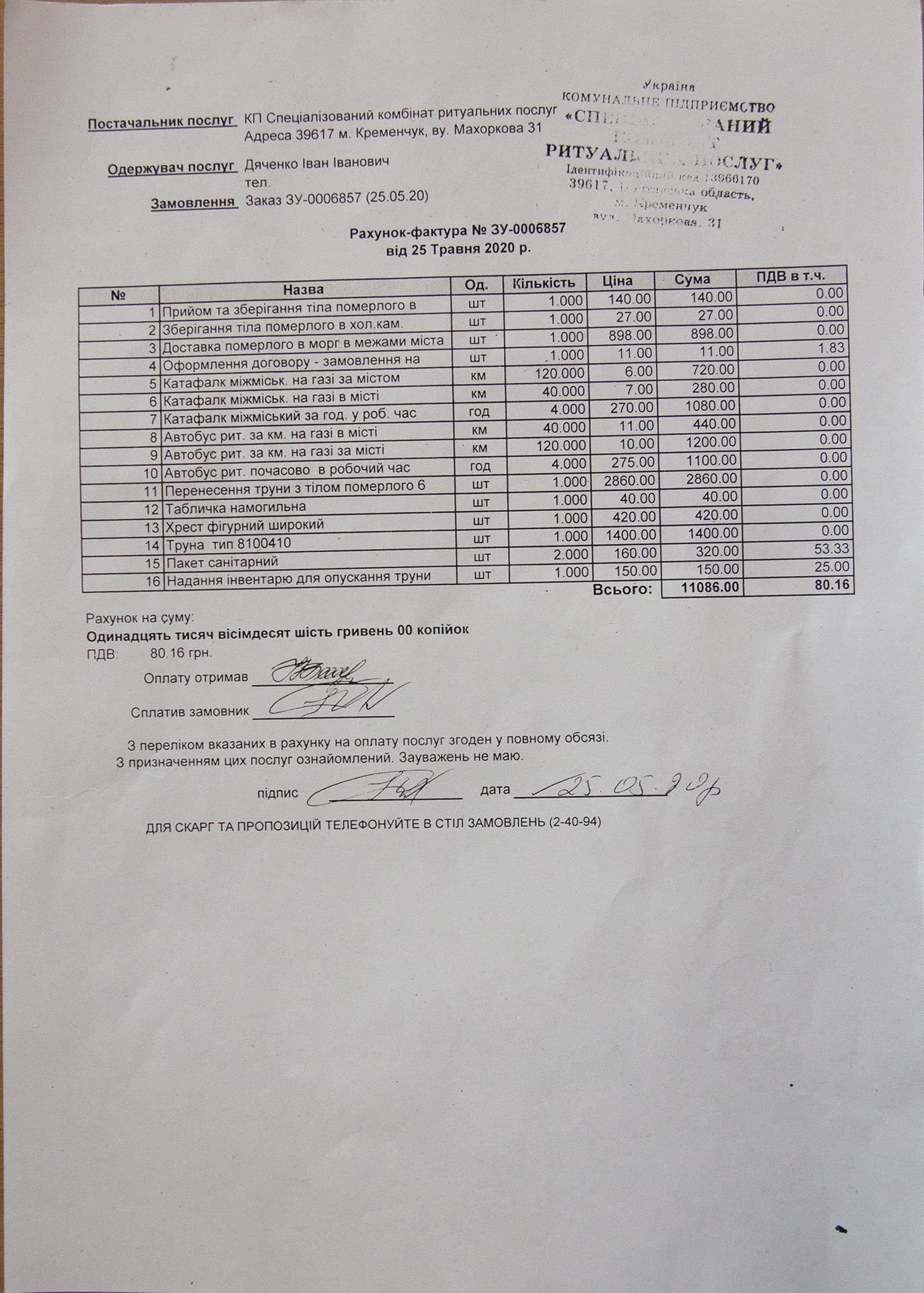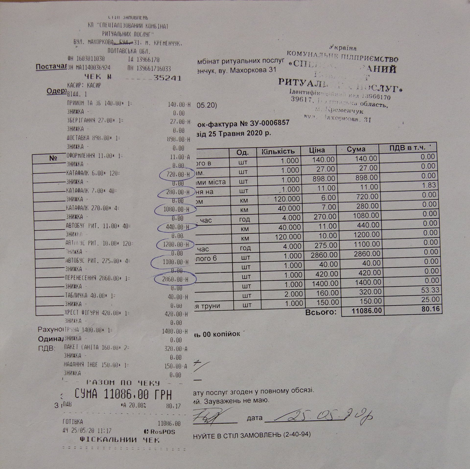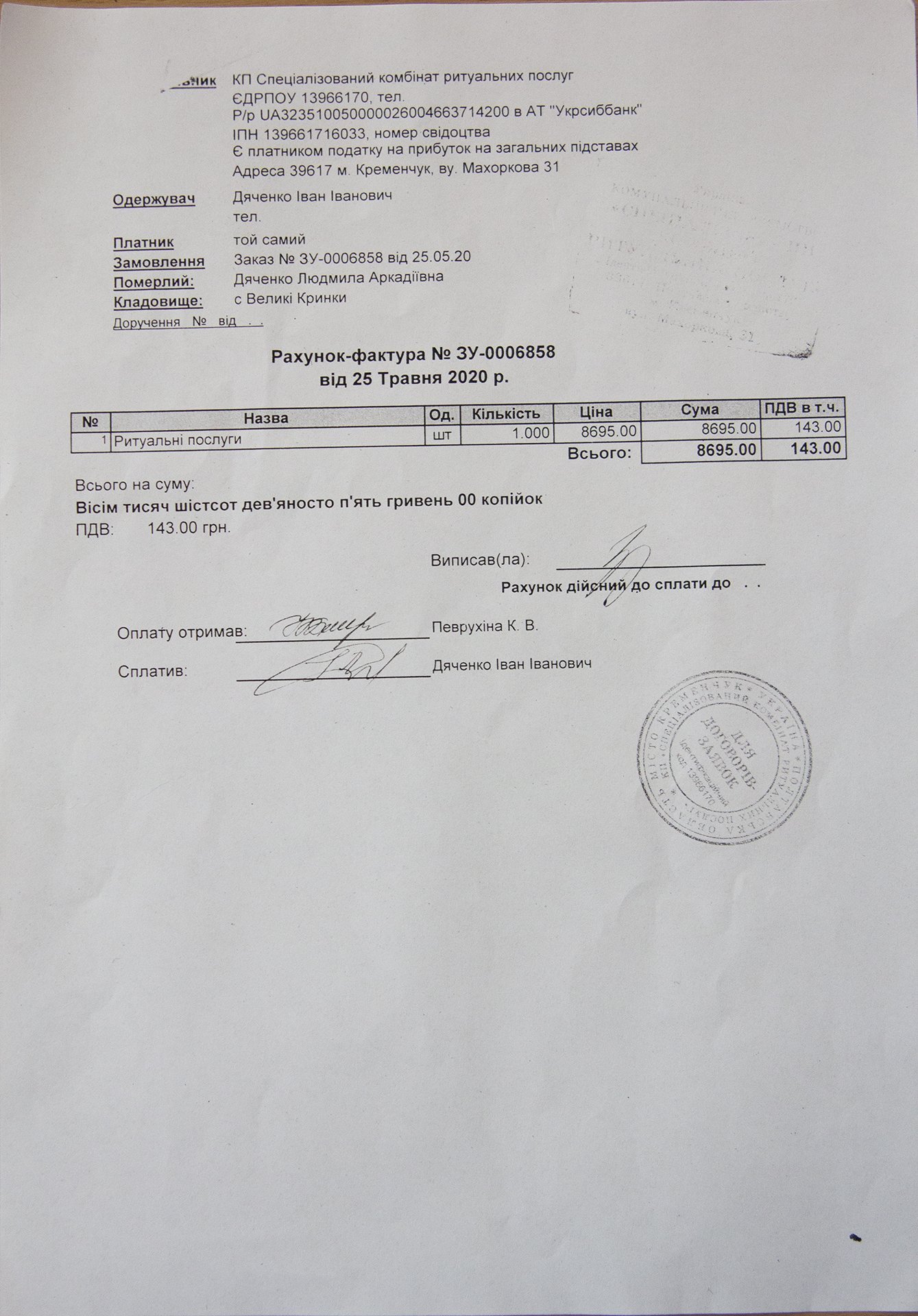 Второй счет-фактура выдан без расшифровки услуг, там лишь одна строка – «ритуальные услуги». И цена – 8695 гривен плюс налог.