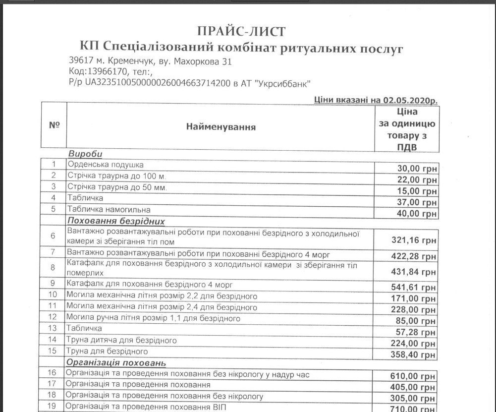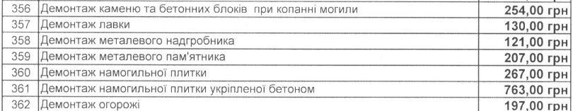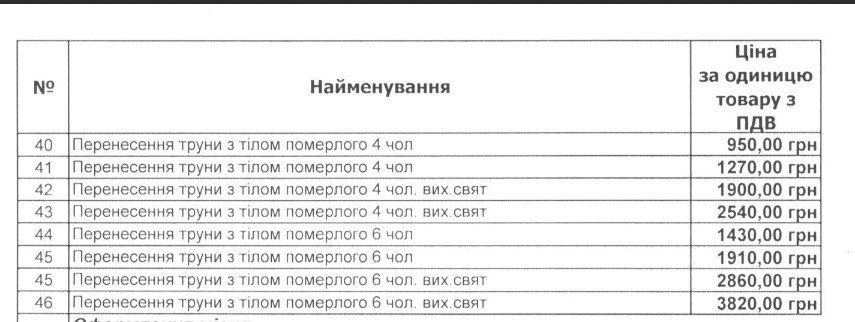 Находим п.45 и искомую цену – 2860 гривен стоит перенос гроба (6 человек) в праздничные и выходные дни. Но Людмилу Дяченко хоронили 25 мая, в понедельник, а не в выходной день. И в рабочее время – в 13 часов. Так за что с родственников умершей содрали 2860 гривен?