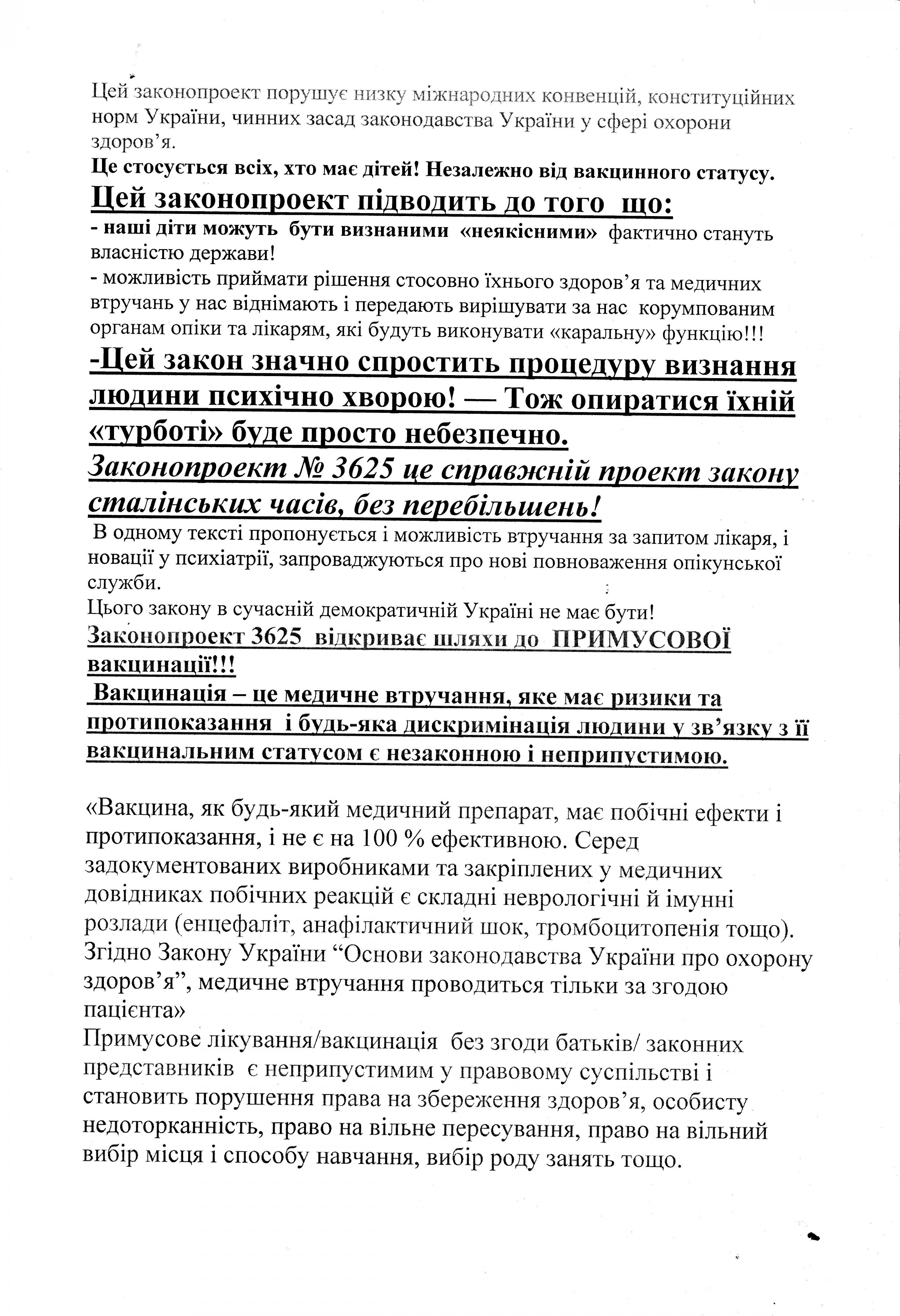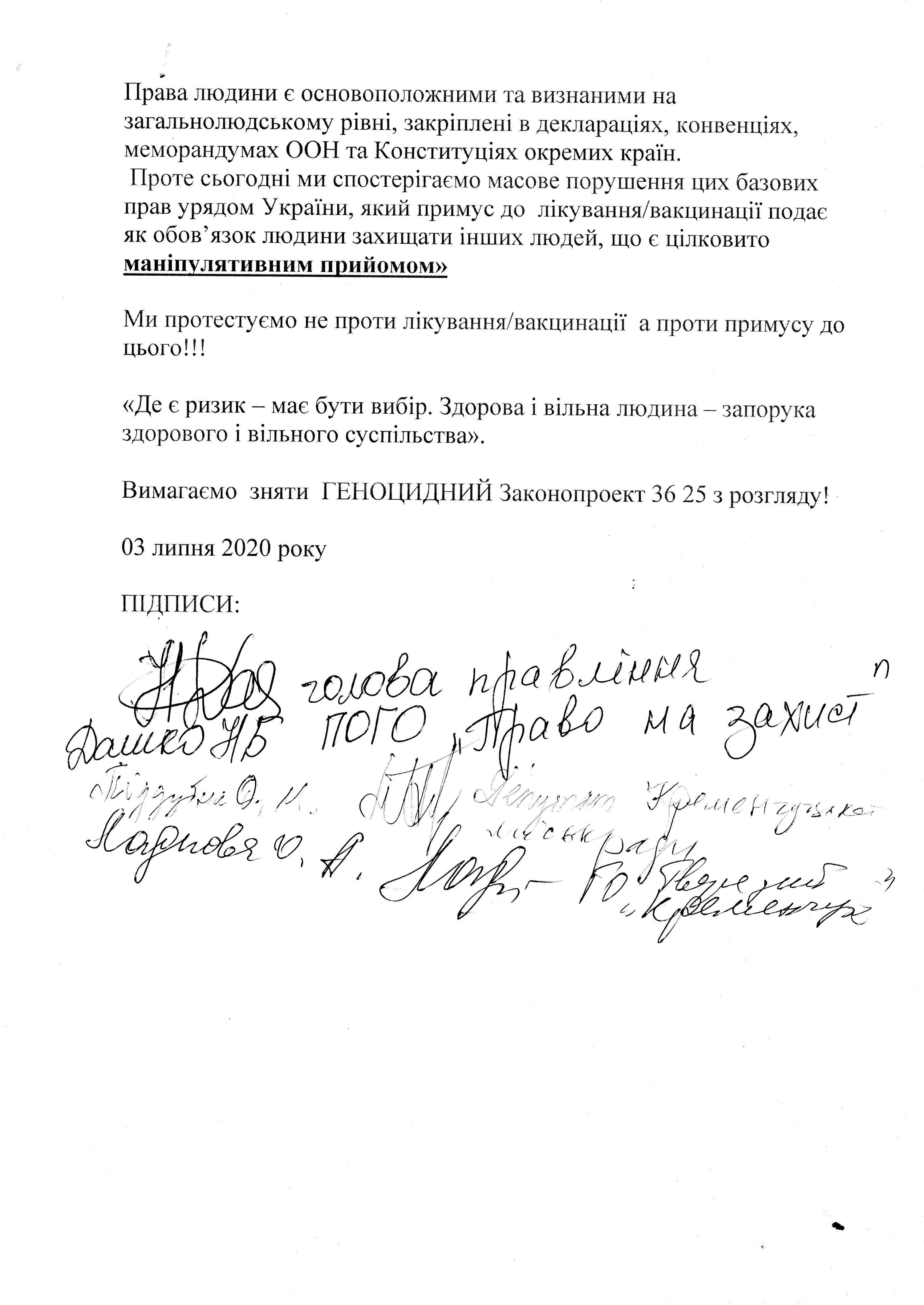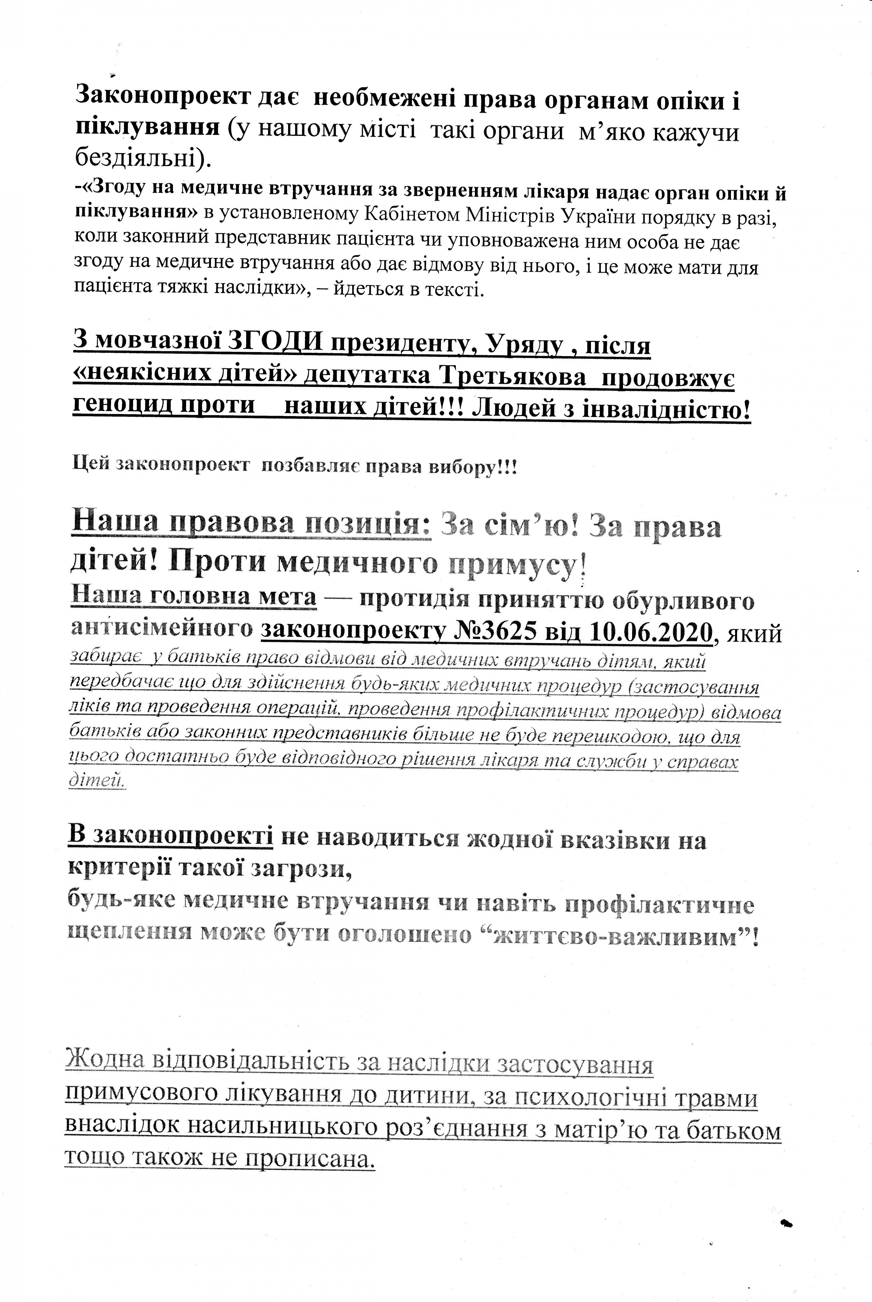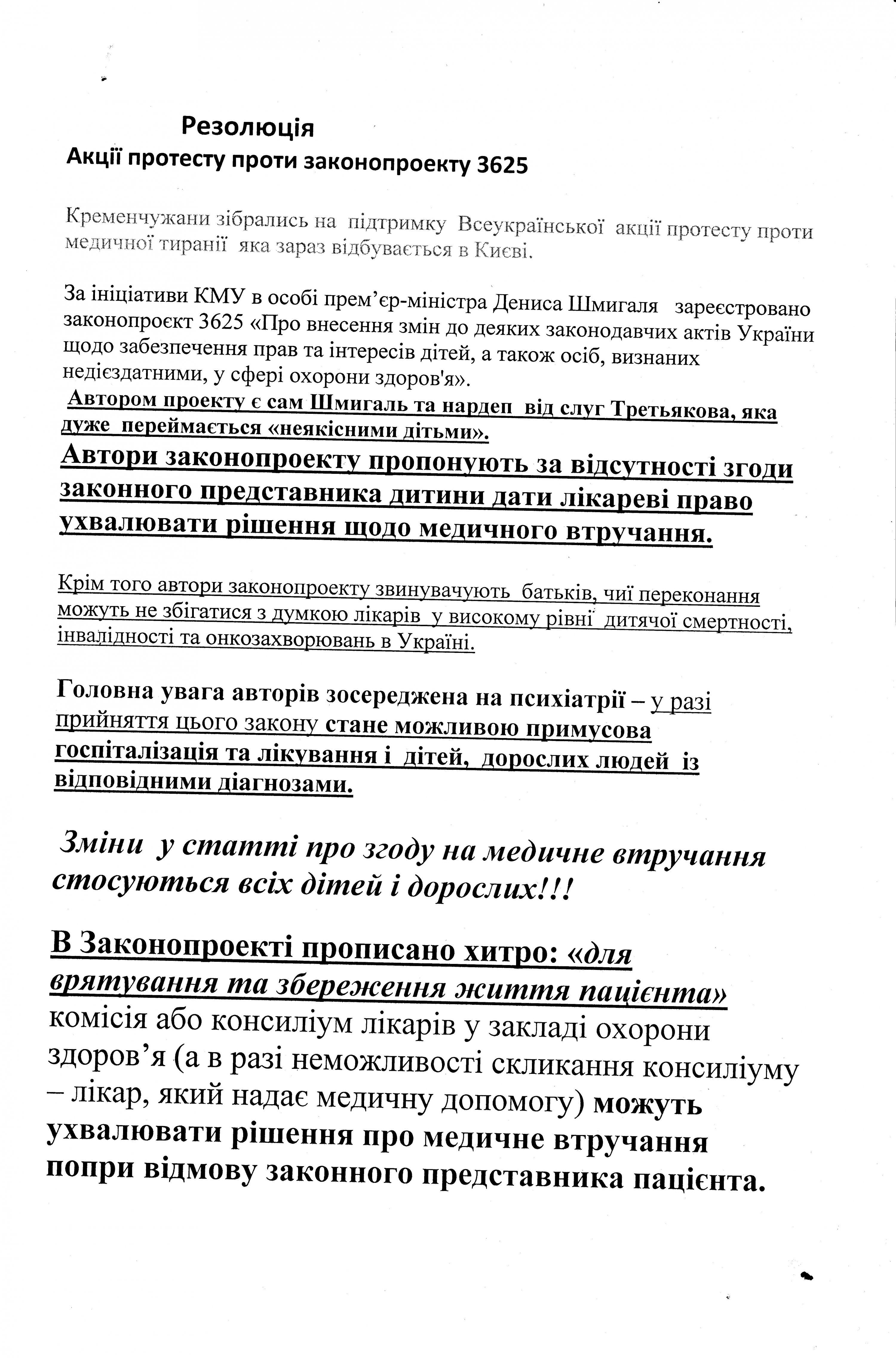 Организаторы кременчугского митинга заявляли, что законопроект №3625 ведет к геноциду, ущемляет права детей, и лишает родителей права защитить своих детей от принудительного медицинского вмешательства или принудительной госпитализации в психиатрические больницы.