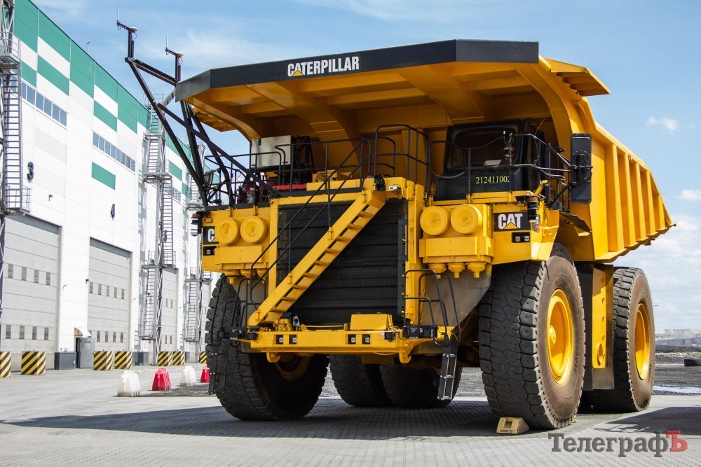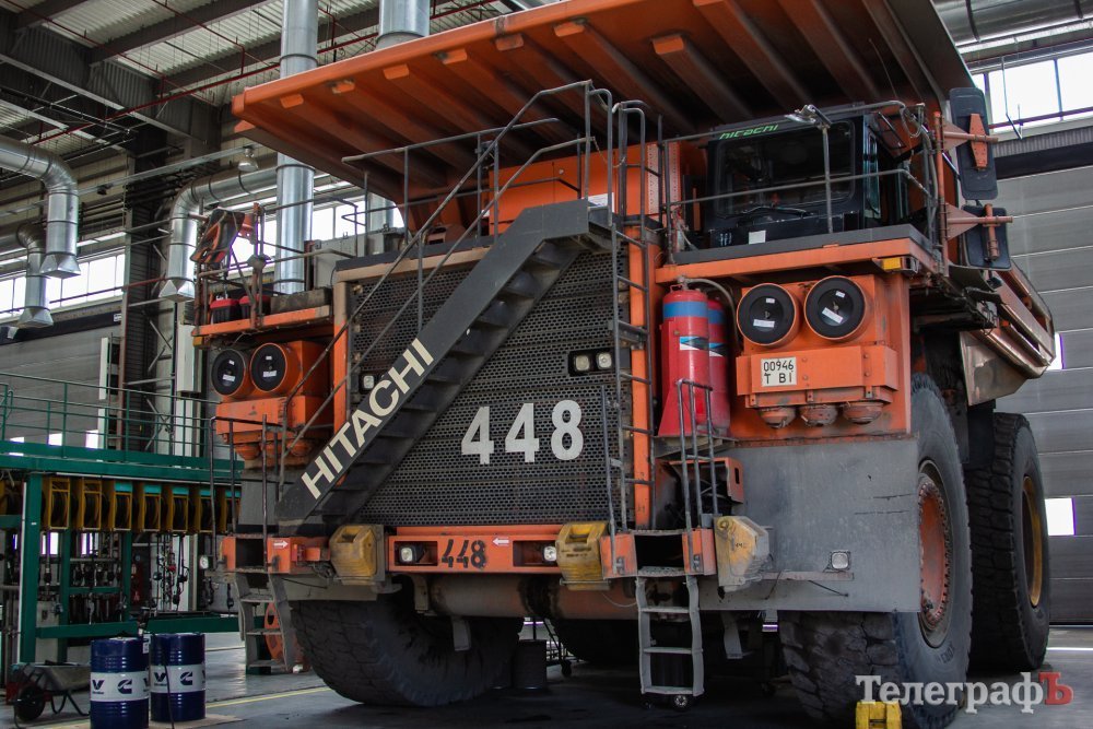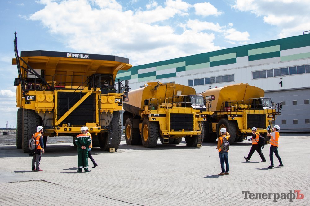 Справа налево: 1) сервисный автомобиль, обслуживающий технику. Благодаря нему можно долить топливо и масло, заменить жидкости. 2) Поливалка для пылеподавления. Грузоподъёмность – 90 тонн. 3) Самосвал грузоподъёмностью 220 тонн. Таких на Еристовском ГОКе 15 единиц. Приблизительная стоимость одной машины – 4 – 4,5 млн долларов.