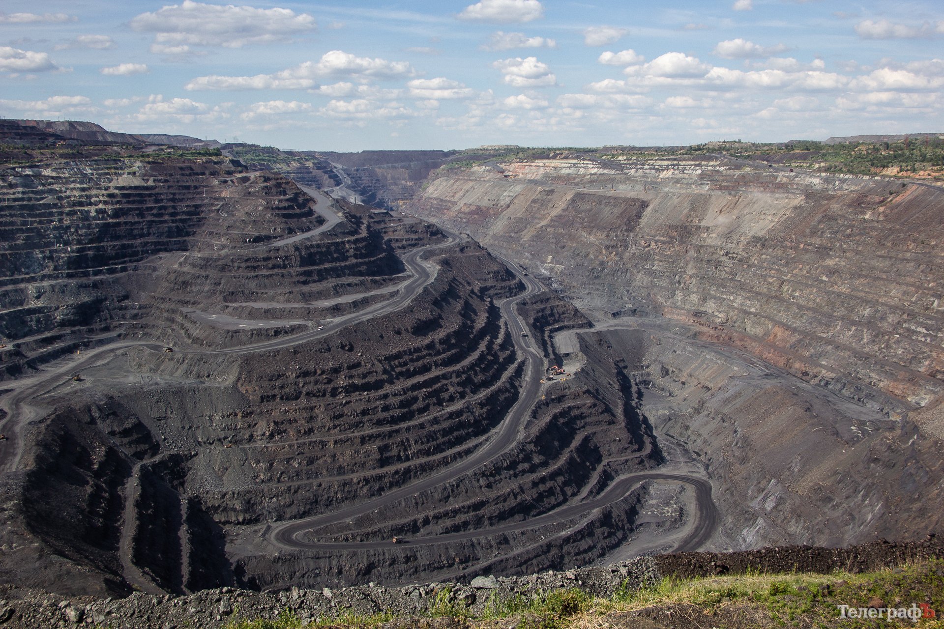 На данный момент параметры карьера таковы: протяженность – около 2,5 километров, ширина – около 1,5 километров. Смотровая площадка находится на отметке «+68 горизонт к уровню моря». Нижняя отметка – «-105 горизонт». 70 метров вскрышных пород (пустая порода, покрывающая залежи полезного ископаемого и вынимаемая при его добыче открытым способом – автор) представлены песком и глиной. Мощность рудного тела – 150-200 метров. Руда добывается с разных горизонтов.